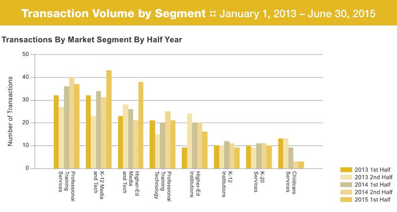 與2014年下半年相比,美國K-12媒體與科技領(lǐng)域的交易數(shù)量增長了39%(從31筆增至43筆),而高等教育媒體與科技領(lǐng)域的交易數(shù)量猛增了81%(從21筆增至38筆)。