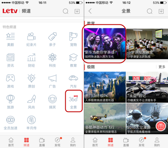 學(xué)員佩戴上VR頭盔,在樂視視頻APP上,點(diǎn)擊樂視教育與新東方合作的“360°全景視頻”,然后打開口語(yǔ)課堂視頻,就能進(jìn)行360°觀看課堂,參與課程進(jìn)度。