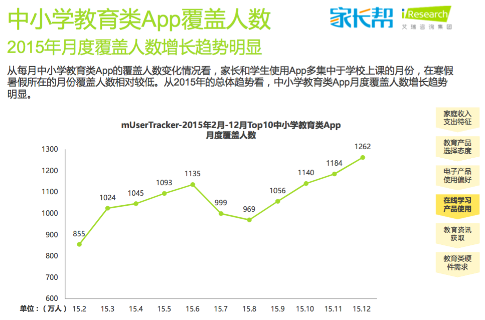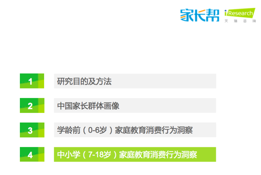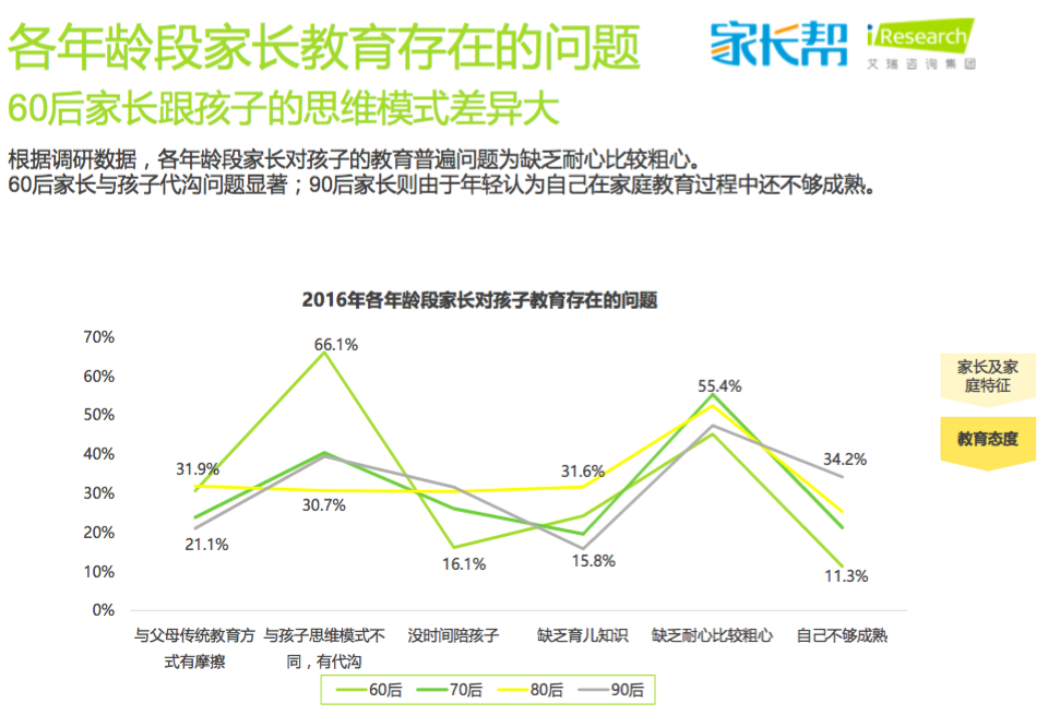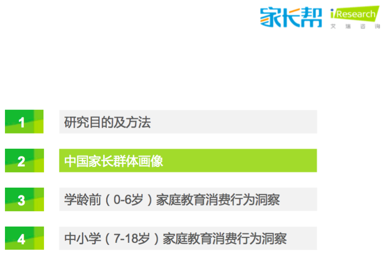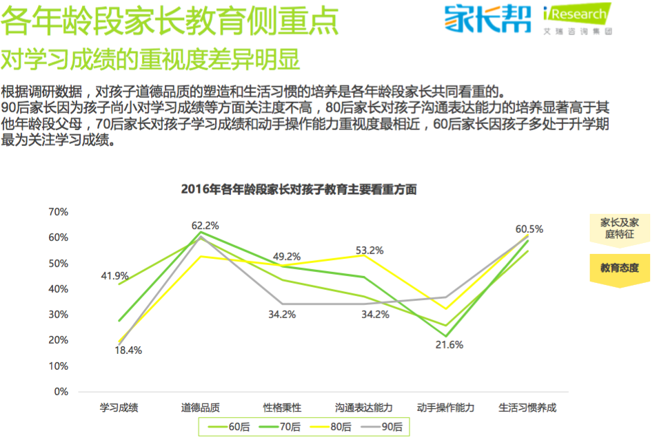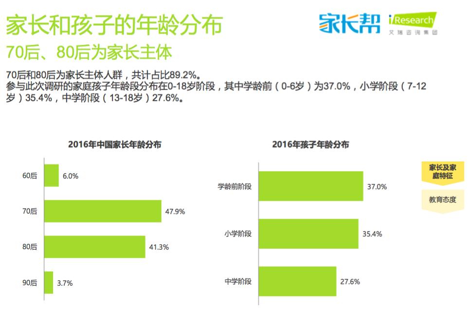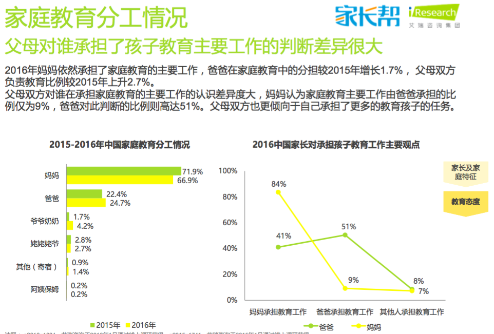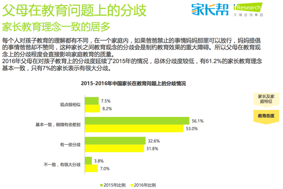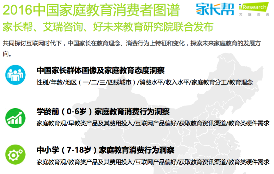 近日,好未來家長幫聯(lián)合艾瑞咨詢發(fā)布了《2016年中國家庭教育消費者圖譜》,通過對1000多位家長在線調(diào)研、40萬PC樣本和200萬手機樣本的監(jiān)測,勾勒出當(dāng)下中國家庭的教育消費特征、教育理念,以及不同家庭對二胎政策、在線教育、低領(lǐng)留學(xué)等熱門話題的傾向性。