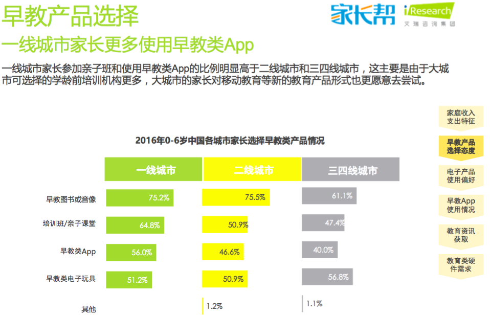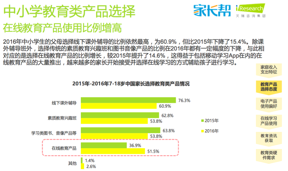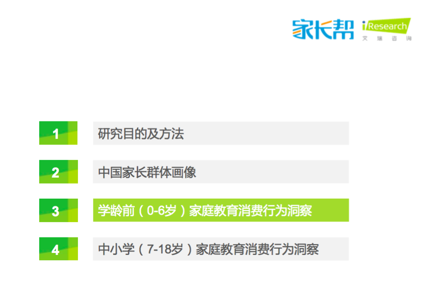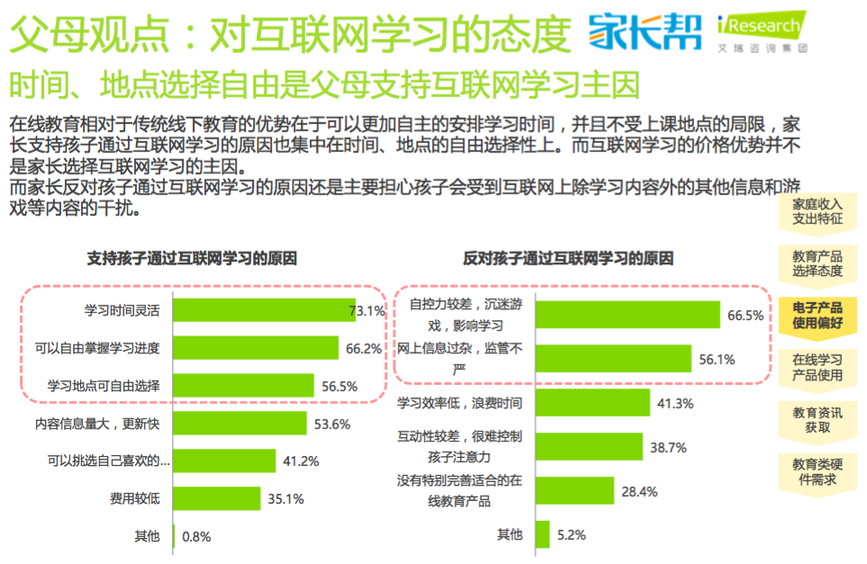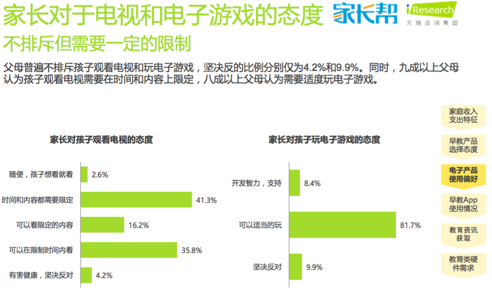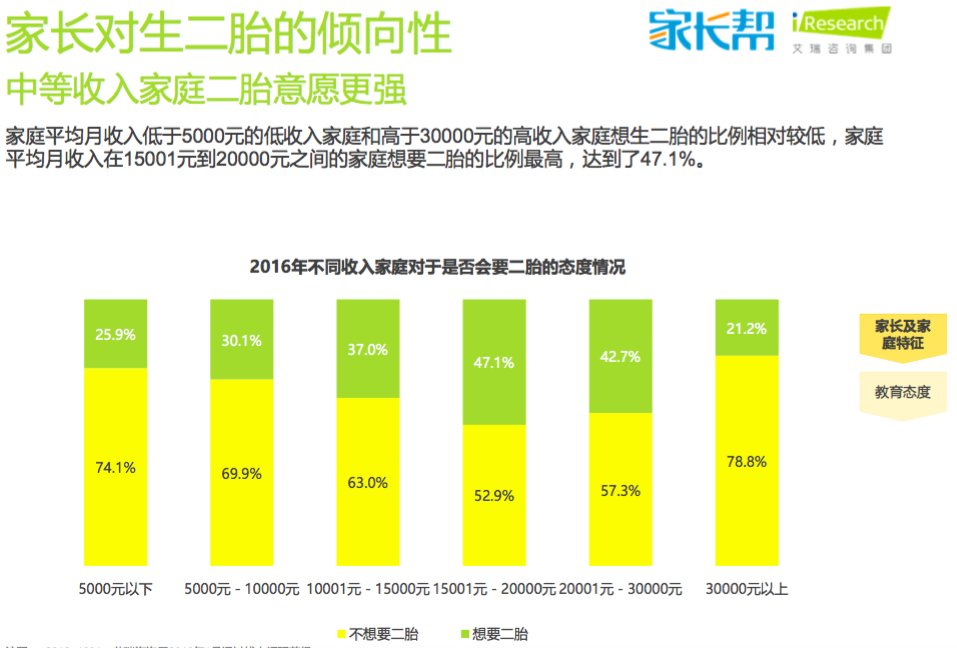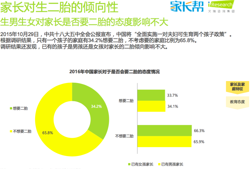 通過對樣本調(diào)查發(fā)現(xiàn),近七成家庭沒有二胎計劃;五成家長選擇在線學(xué)習(xí)產(chǎn)品;素質(zhì)教育與低齡留學(xué)漸漸成為家長教育新風(fēng)向。