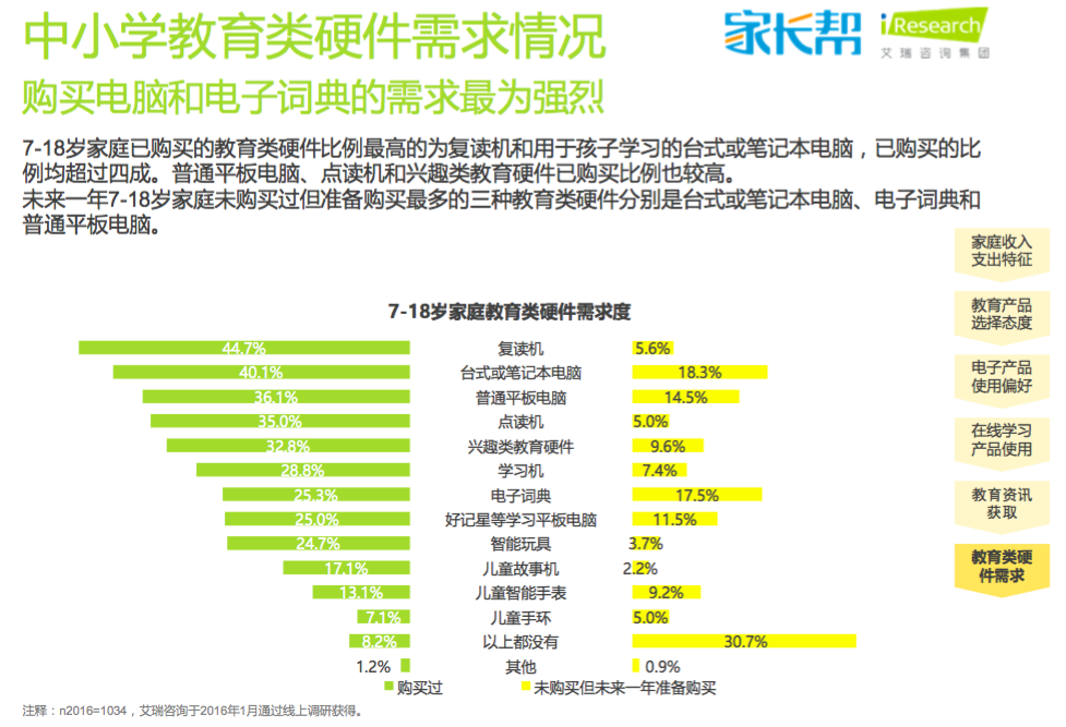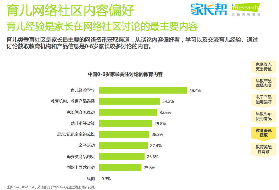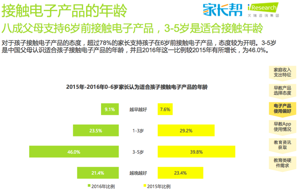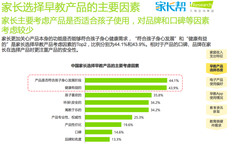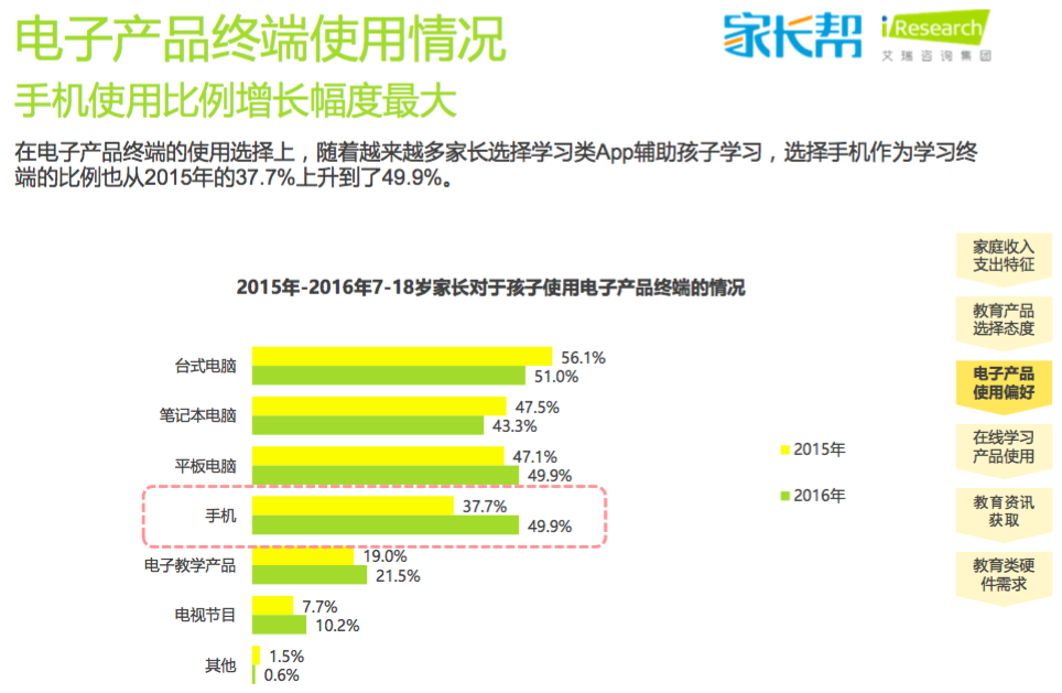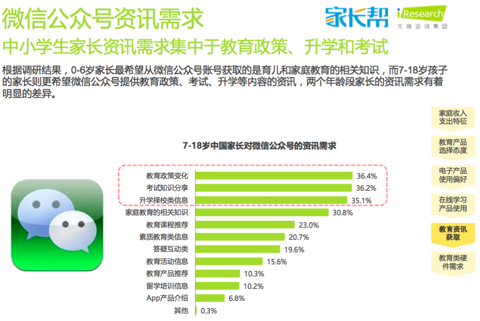 通過對樣本調(diào)查發(fā)現(xiàn),近七成家庭沒有二胎計劃;五成家長選擇在線學(xué)習(xí)產(chǎn)品;素質(zhì)教育與低齡留學(xué)漸漸成為家長教育新風(fēng)向。