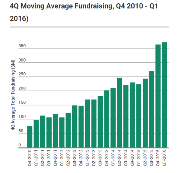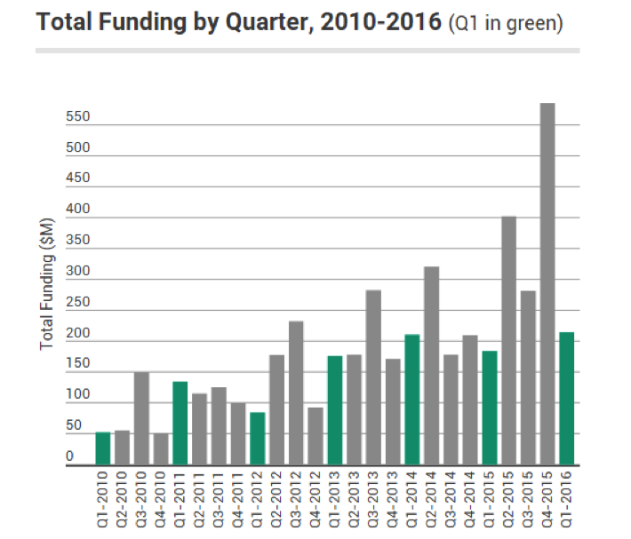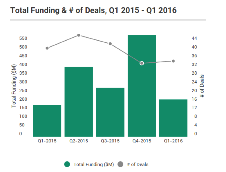 圖表1:2016年第一季度,融資金額從2015年第四季度的5.85億美元下降至2.15億美元。這種下滑看似是災(zāi)難性的,但是2016年第一季度的交易總金額與2015年第一季度相比,其實出現(xiàn)了同比增長。事實上,2016年第一季度是過去6年來第一季度融資總金額最高的(參見圖表4)。交易總數(shù)量在第一季度保持穩(wěn)定,為35筆(2015年第四季度為34筆)。