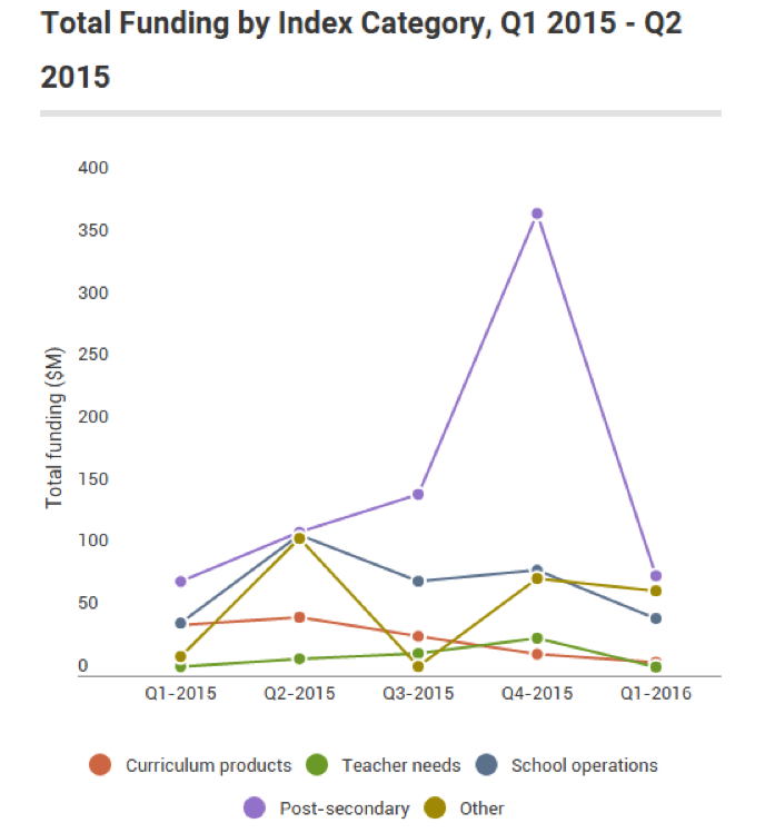 Educated Ventures創(chuàng)始人Christopher Nyren提醒大家不要過度解讀一個季度的數(shù)據(jù)。他認為:“與其他行業(yè)的融資金額相比,教育科技風投融資黯然失色,使得進行季度與季度的對比幾乎毫無統(tǒng)計學意義。”他還指出,單是Uber一家公司就在2015年獲得了12億美元融資。(根據(jù)EdSurge統(tǒng)計的數(shù)字,美國教育科技初創(chuàng)企業(yè)去年融資總金額為14.5億美元)。