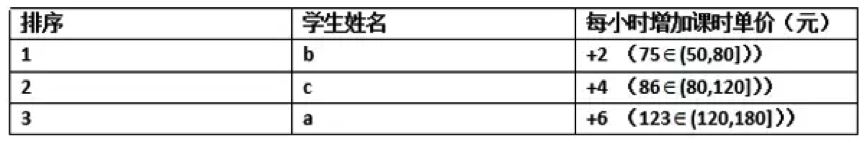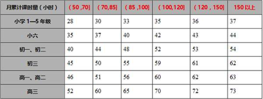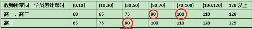 比如,A教師4月份總上課課時數(shù)是60小時,其中高一學員a本月上了20課時(a在A老師這的累計課時:55),高二學員b本月上了30小時(b在A教師這的累計課時:95),高三學員c本月上了10小時(c在A教師這的累計課時:45),根據(jù)下表,