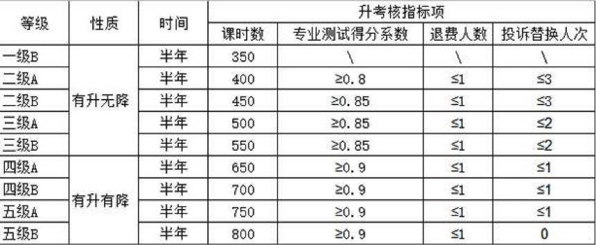 根據(jù)下圖我們可以看到,學生退費、投訴人數(shù)半年內(nèi)最多有一個人的老師也只能是4A級別。這都是機構(gòu)內(nèi)該科目的天了,如果你今天降級,他明天就能出去找一份比你薪酬還高的工作,所以級是萬萬不能降的。不升級就等于降級了。