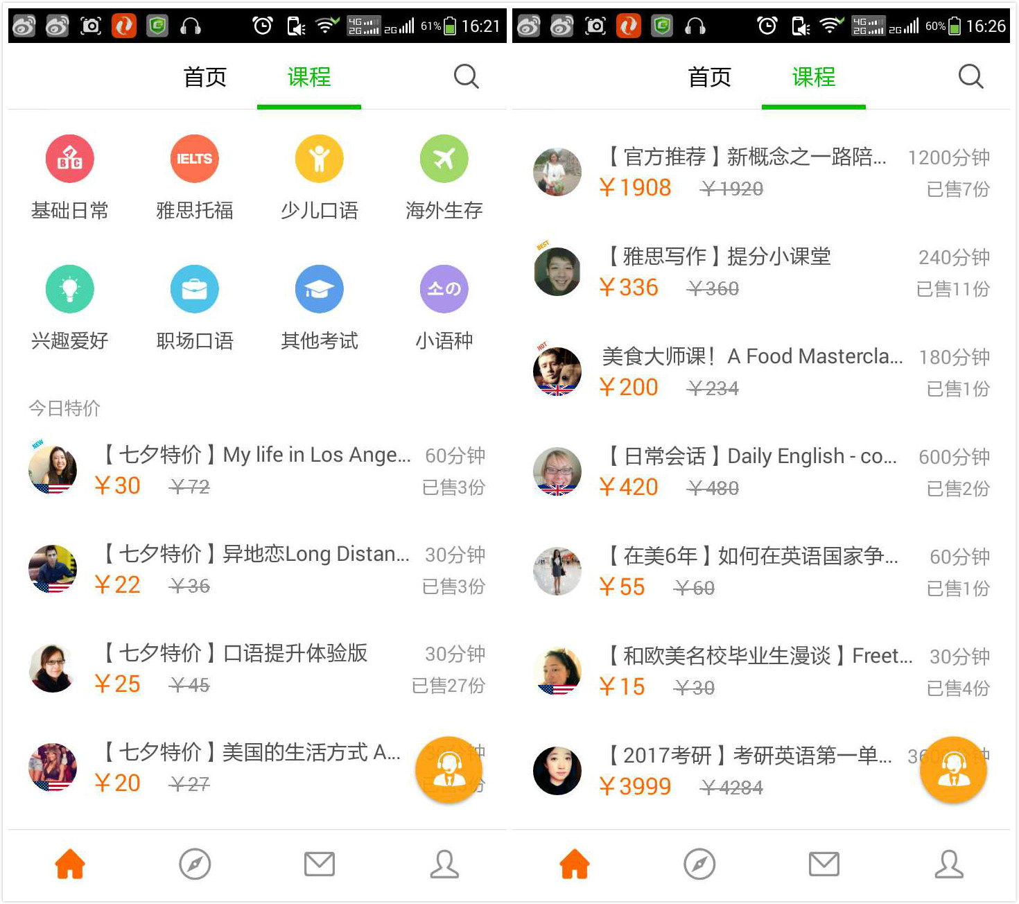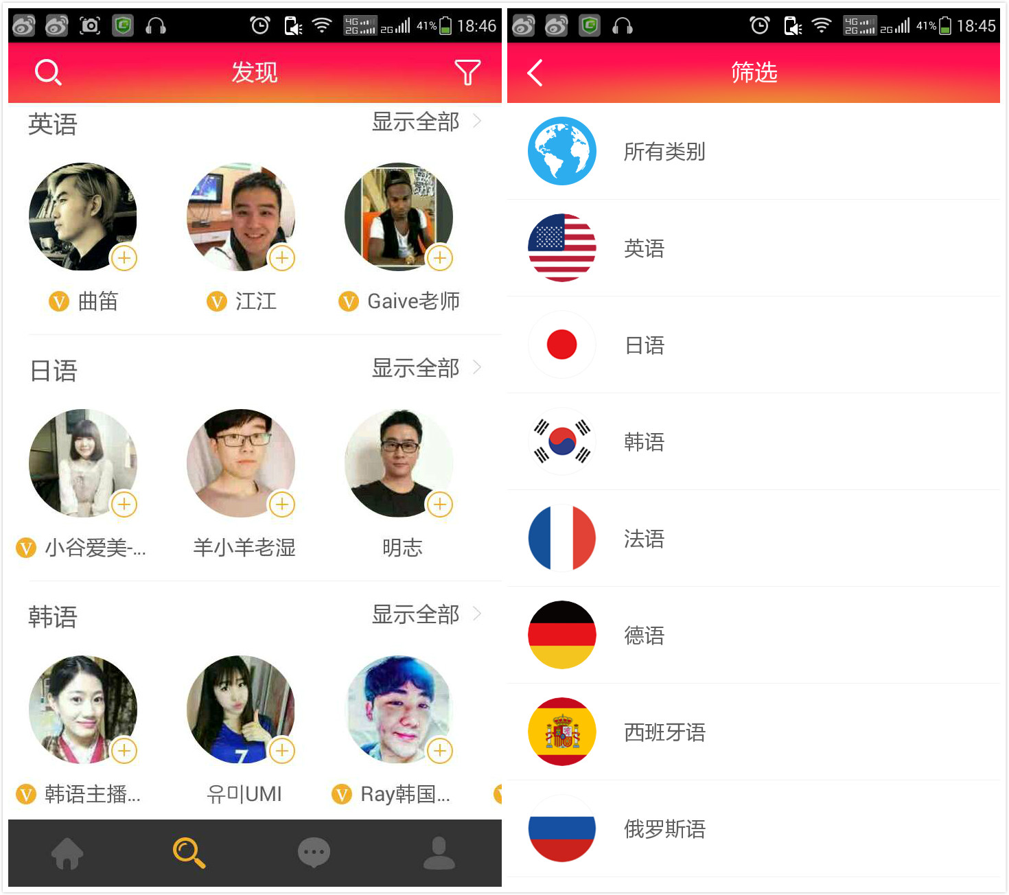 進入軟件首頁就是各語種老師的推薦,有的老師根據(jù)自身的推廣需要通過了加V認證。主要教學語言包括英語、日語、韓語、德語、法語、俄語、西班牙語、阿拉伯語和國內(nèi)方言。