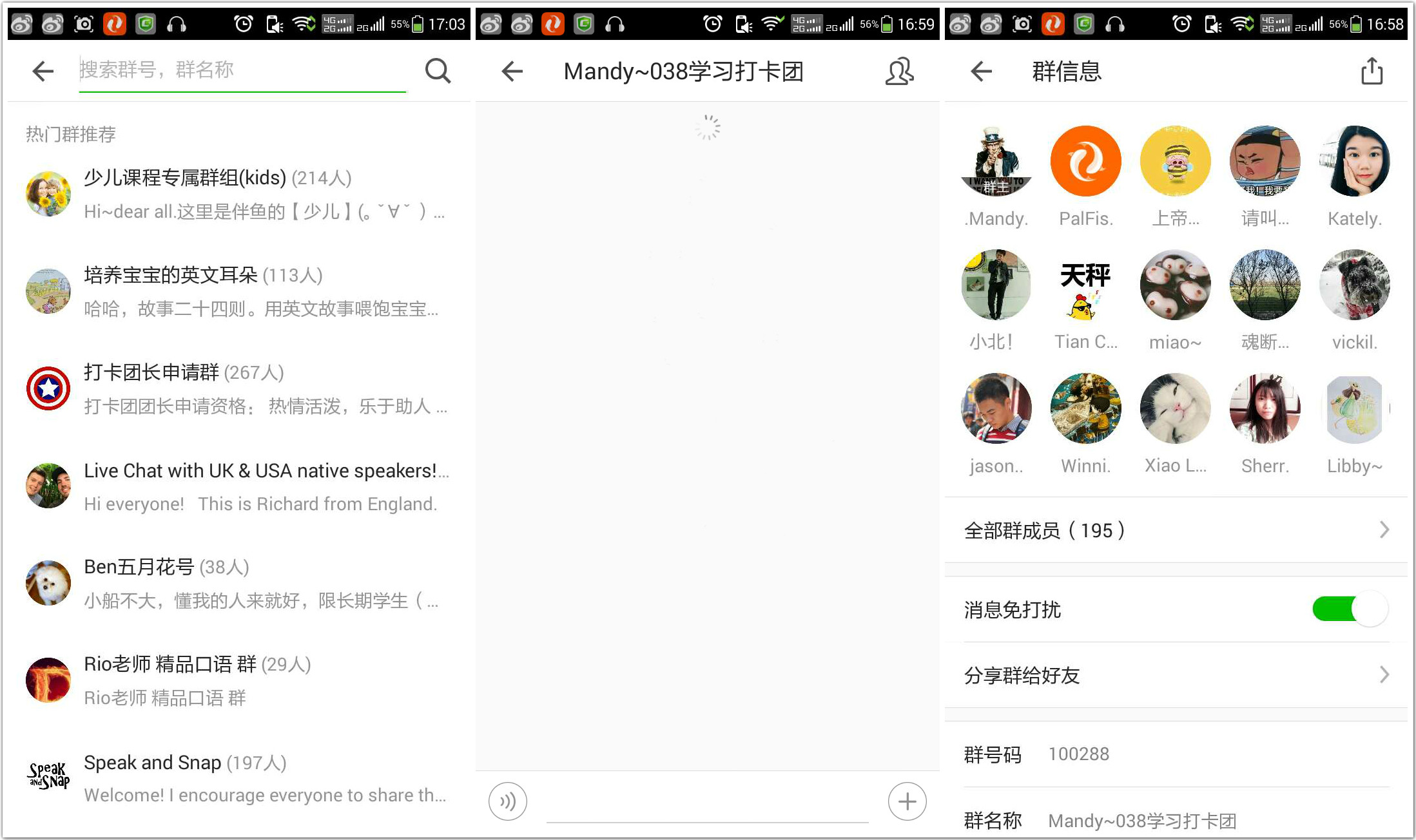 用戶可建立“群組”進行互動交流,監(jiān)督學習打卡。群組界面與微信相似,具有發(fā)送語音和圖片功能。