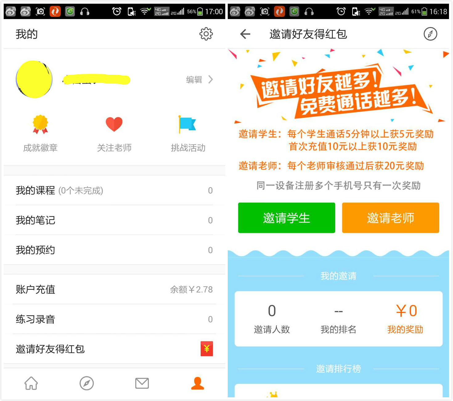 用戶個人界面顯示已有課程、筆記和賬戶等信息,賬戶可以充值或者通過邀請好友、打卡、與老師一對一通話等方式獲得紅包。