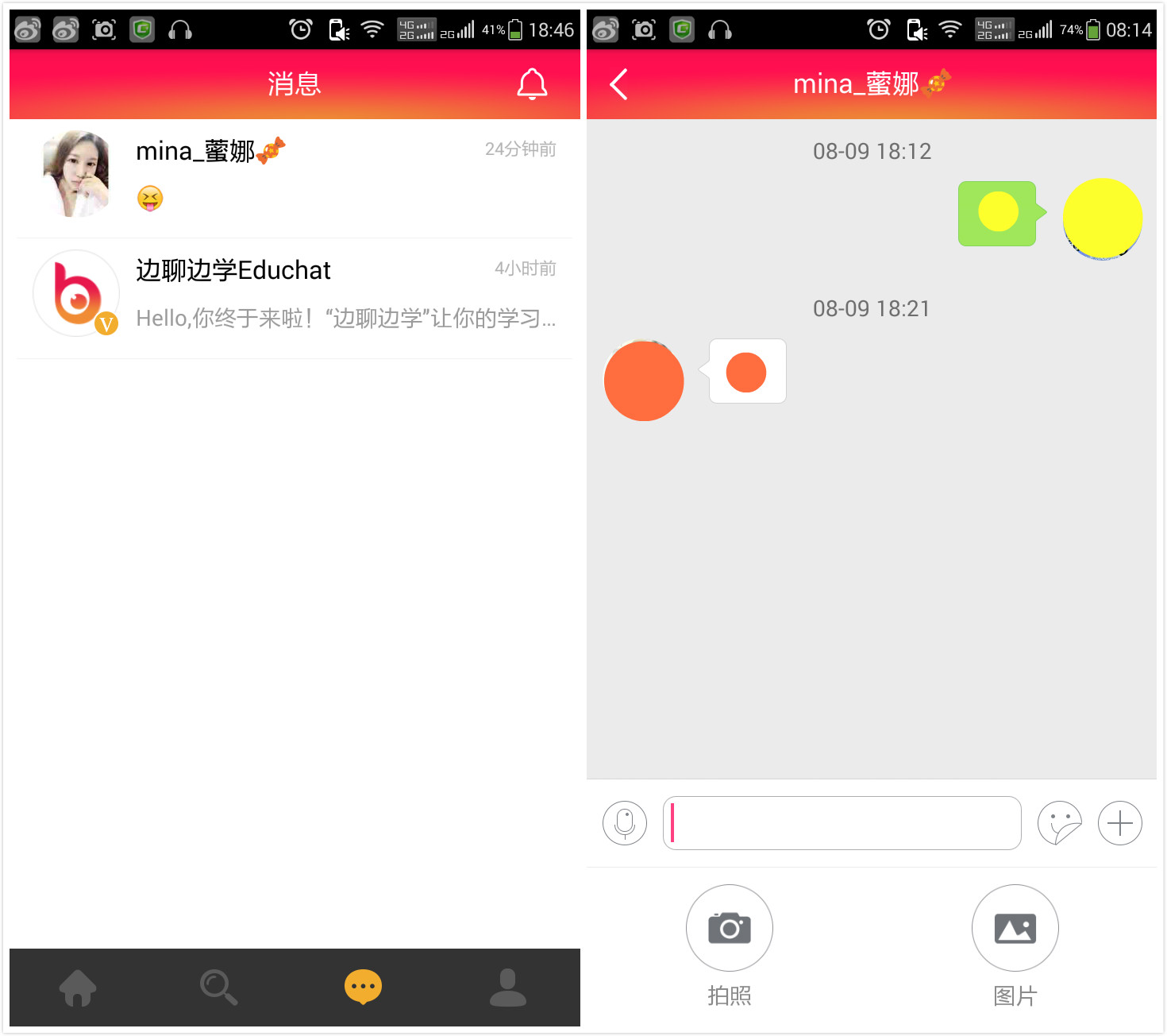 在“消息”欄目,用戶可以和其他同學或老師互動交流。消息界面具有發(fā)送語音、圖片和表情功能。