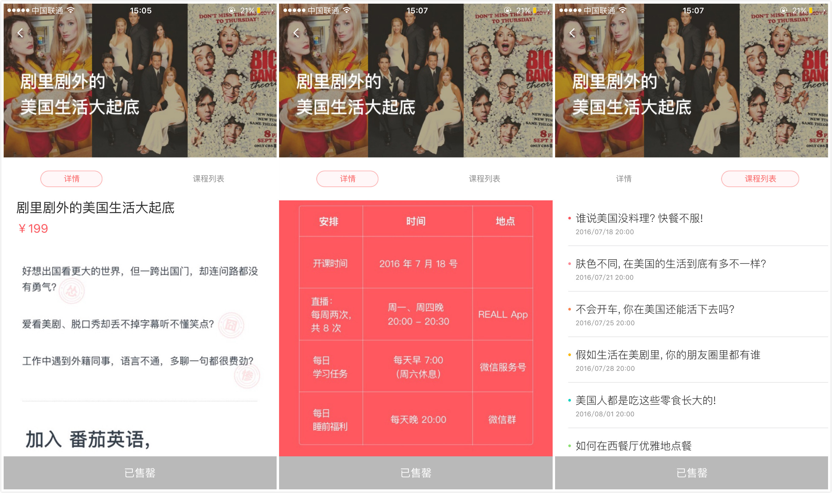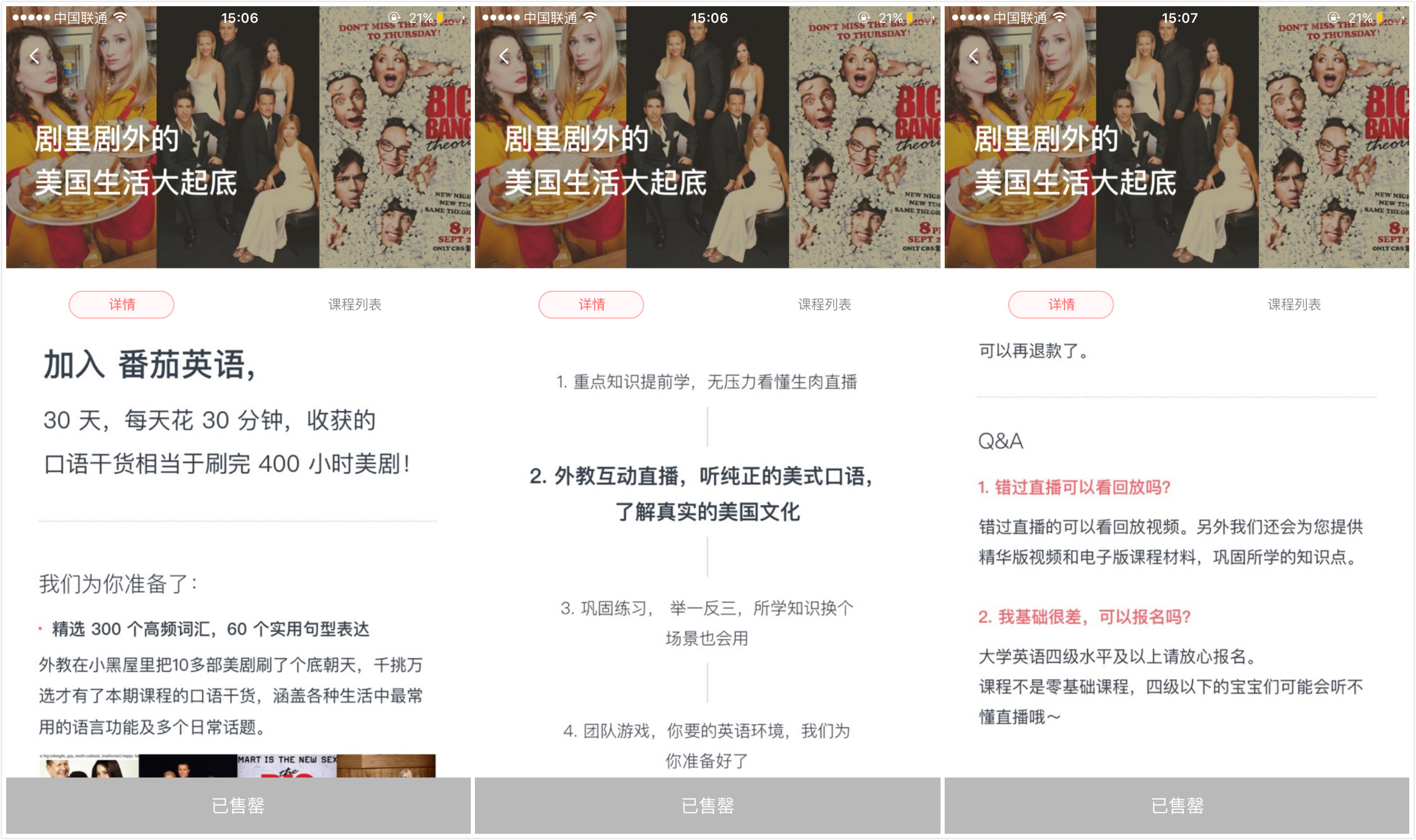 截至目前筆者登錄番茄英語賬號時,在售課程僅有“劇里劇外的美國生活大起底”一門,共8節(jié)課,且已售罄;