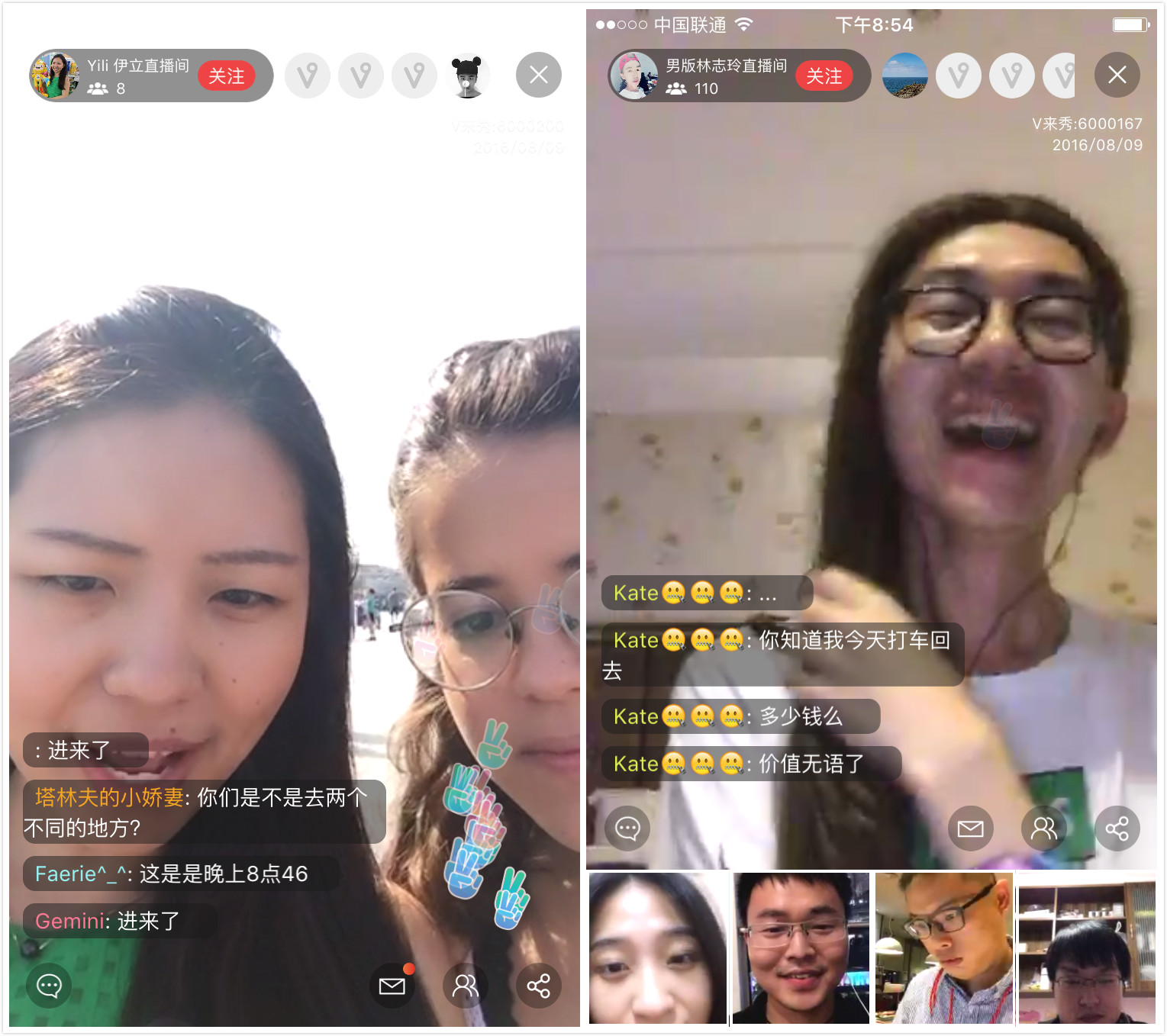 直播界面左上角顯示在線觀看人數(shù)和主播個人介紹入口。用戶在直播現(xiàn)場可以發(fā)起評論與主播互動,甚至直接與主播視頻連線。一場直播最多容納四位用戶同時連線,整個連線過程其他用戶可以觀看并參與文字互動。