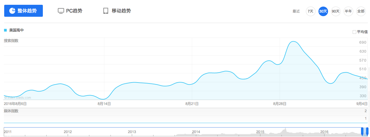 (圖為百度指數(shù)中“美國高中”搜索量變化趨勢)