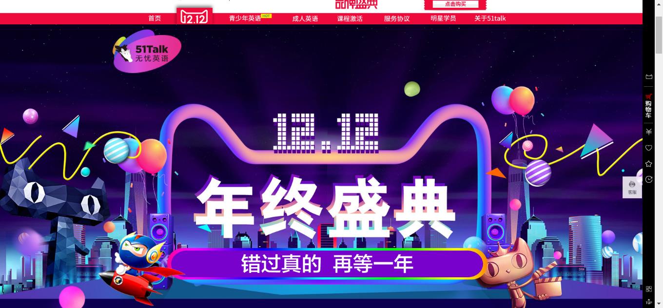 51Talk延續(xù)了雙十一的促銷力度,在用1元白菜價購買3節(jié)成人/青少外教體驗課的活動導流的同時,推出1元抵900的抵價券、發(fā)放代金券,學習卡套餐和包月學習套餐5折起優(yōu)惠,活動時間為12月2日至雙十二當天。
