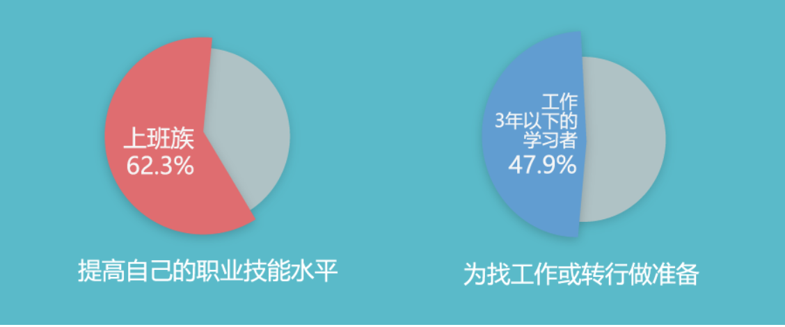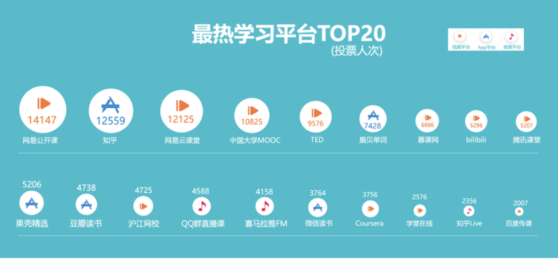 值得注意的是,TED、Bilibili這類非傳統(tǒng)意義教育資源提供者也進入了學(xué)習(xí)者視野,躋身前十,同樣受到了知識青年們的追捧。微課、喜馬拉雅FM等音頻平臺和知乎、扇貝單詞等App產(chǎn)品,也成為了在線學(xué)習(xí)者的重要知識獲取渠道。