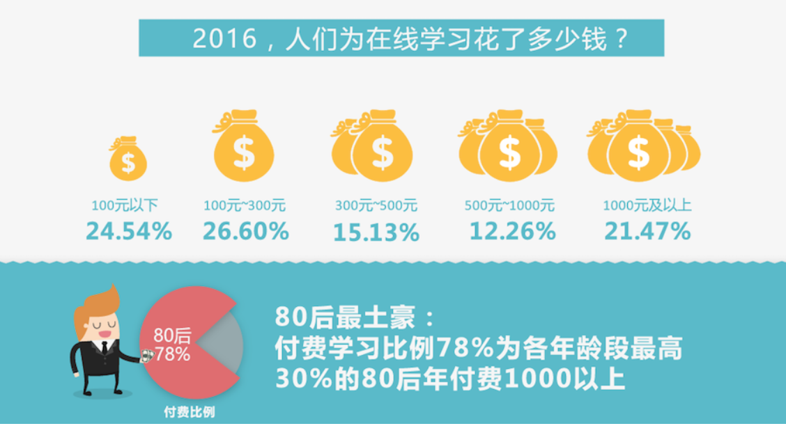 果殼網(wǎng)MOOC學(xué)院報告稱,70%在線學(xué)習(xí)者在過去的一年中為在線學(xué)習(xí)付費,這一數(shù)字在2015年僅為26%。