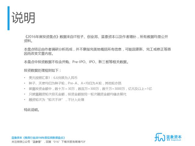 編者按:藍象資本近日發(fā)布了《教育行業(yè)2016年投資數(shù)據(jù)盤點》的報告。報告顯示,人民幣資金超過美元資金成為主流;教育信息化和企業(yè)服務發(fā)展?jié)摿薮?;B2B模式優(yōu)勢顯現(xiàn);少兒英語較成人英語只增不減。
