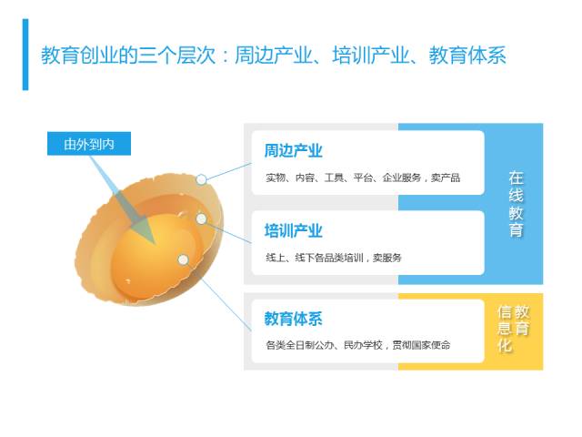 根據(jù)藍象資本的報告【藍象觀點】超75%品類可在線培訓,直播創(chuàng)業(yè)依然機遇無限,教育創(chuàng)業(yè)項目有三個層次,從外到內(nèi),分別是周邊產(chǎn)業(yè)、培訓產(chǎn)業(yè)、教育體系。