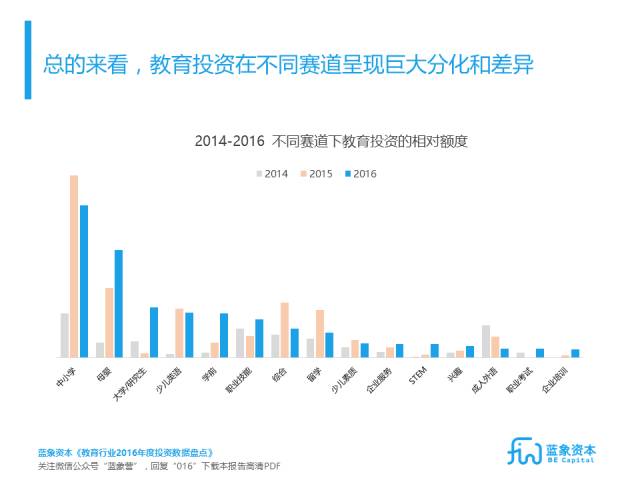 按照客戶群年齡段和服務對象的不同,藍象資本將教育行業(yè)劃分為15個不同的用戶需求和賽道,上圖是這些賽道2014年到2016年的相對投資金額。