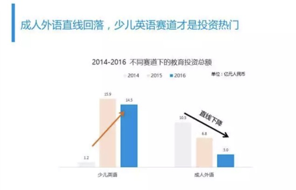 來自藍(lán)象資本的數(shù)據(jù)顯示,2014-2016年,少兒英語的投資額從1.2億元人民幣增長到14.5億人民幣,而成人外語的投資額直線下降 。