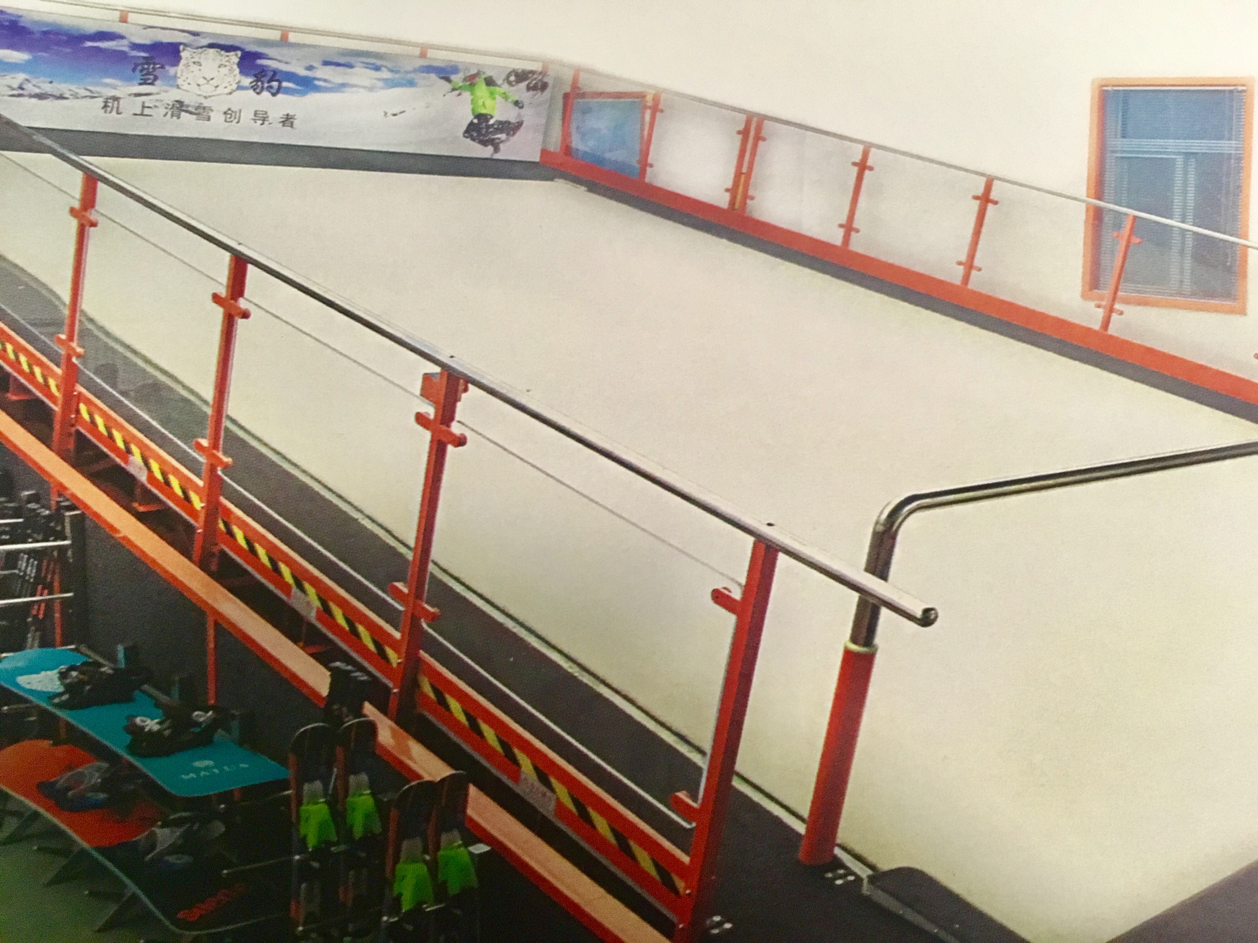 其實(shí)這是一款智能設(shè)備,在一定大的室內(nèi)空間中就可以實(shí)現(xiàn)滑雪教學(xué)。雪毯像跑步機(jī)的傳送帶一樣可以滾動起來,坡度、速度都可以根據(jù)教學(xué)情況進(jìn)行調(diào)節(jié)。
