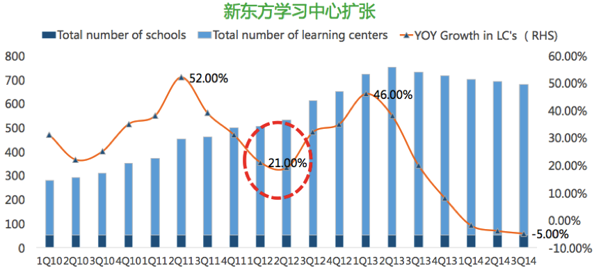 把2005年-2016年在美國(guó)上市公司財(cái)務(wù)數(shù)據(jù)做一個(gè)整體研究,我們會(huì)發(fā)現(xiàn)在2012年前后教育類(lèi)的上市公司財(cái)務(wù)結(jié)構(gòu)發(fā)生了根本性的變化:2012年以前的營(yíng)收利潤(rùn),凈利潤(rùn)是在呈現(xiàn)上市趨勢(shì);但是在2012年前后,現(xiàn)了一個(gè)比較大的營(yíng)收和利潤(rùn)的下滑,擴(kuò)張步伐放緩。以新東方為例,2013年2季度學(xué)習(xí)中心的擴(kuò)張速度降到了歷史最低水平—21%,凈利潤(rùn)率降到20%以下。