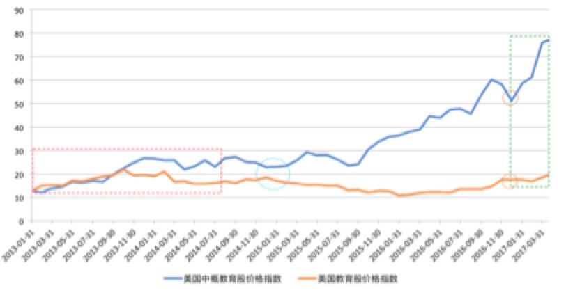 2015年的1月31號(hào)到2016年1月31號(hào)一年的時(shí)間,美國(guó)上市的教育企業(yè)股價(jià)指數(shù)持續(xù)下調(diào)。中國(guó)的教育類(lèi)公司它的股價(jià)在持續(xù)上漲。2015年的1月是《民促法》一審稿提交的時(shí)間,正是由于這樣的一個(gè)制度性的變革,導(dǎo)致了美國(guó)和中國(guó)教育類(lèi)公司股價(jià)出現(xiàn)了一個(gè)背離。第二個(gè)背離的最關(guān)鍵的時(shí)期是在2016年11月份,2016年7月份由于特朗普當(dāng)選,提出一些列刺激經(jīng)濟(jì)增長(zhǎng)的政策,利好美國(guó)股市,教育股也隨著大盤(pán)的走勢(shì)在往上走。