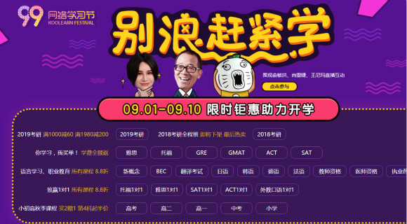 “99網(wǎng)絡(luò)學(xué)習(xí)節(jié)”是新東方在線在去年9月推出的大型線上名師直播活動。今年的主題是“別浪趕緊學(xué)”并邀請俞敏洪、王尼瑪和尚雯婕坐陣“99網(wǎng)絡(luò)學(xué)習(xí)節(jié)”,吸引用戶關(guān)注。