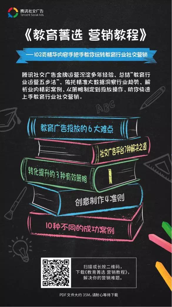 多知網(wǎng)11月13日消息,近日,騰訊社交廣告發(fā)布了教育行業(yè)營銷手冊(cè)——《教育菁選,營銷教程》以幫助教育行業(yè)品牌主應(yīng)對(duì)“流量紅?!钡木置妫鉀Q“尋找用戶難”、“機(jī)會(huì)流失快”“客戶復(fù)購率低”等營銷核心痛點(diǎn)。