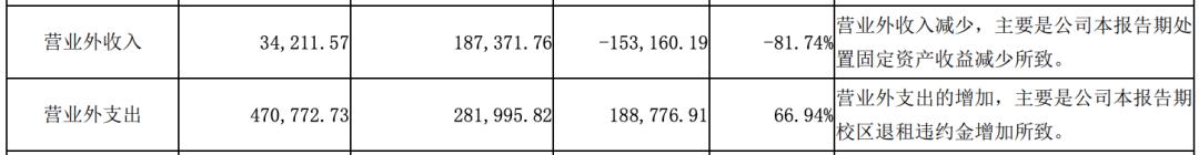 財(cái)報(bào)顯示,報(bào)告期內(nèi),紫光學(xué)大營(yíng)業(yè)外收入減少81.74%,原因?yàn)閳?bào)告期處置固定資產(chǎn)收益減少;而營(yíng)業(yè)外支出增加66.94%,原因?yàn)樾^(qū)退租違約金增加。