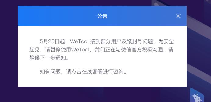 多知網(wǎng)5月26日消息,昨日晚間,有多個網(wǎng)友爆料,第三方微信粉絲和社群管理工具WeTool被微信禁用,數(shù)百個微信號被封號,上千客戶瞬間蒸發(fā)。隨后WeTool官方發(fā)布通知稱“正在與微信官方積極溝通,請靜候下一步通知”。