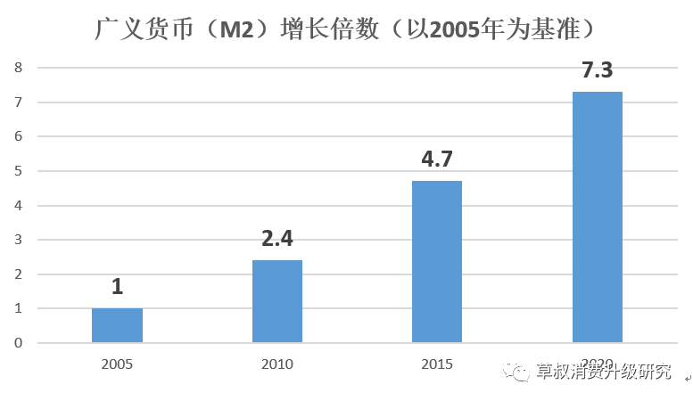 那么貨幣增長大概是個什么程度呢?以2005年的M2為基準(zhǔn)1的話,2010年大概是2.4x,2015年大概是4.7x,2020年大概是7.3x。