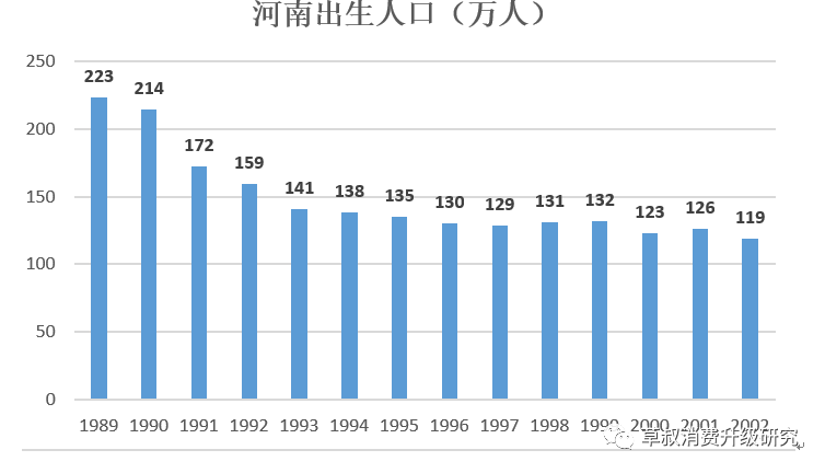 1990年——2002年,河南省出生人口從214萬,降低到119萬人,近乎腰斬,可以說是遭遇了出生人口斷崖式下滑,這和全國的情況也相合。
