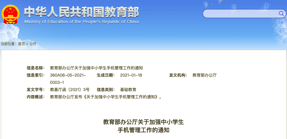 多知網(wǎng)3月4日消息,今日,江蘇省發(fā)布《省教育廳辦公室關(guān)于轉(zhuǎn)發(fā)教育部辦公廳加強(qiáng)中小學(xué)生手機(jī)管理工作的通知》,確定執(zhí)行此前教育部要求,通知中指出要求各設(shè)區(qū)市、縣(市、區(qū))教育局于2021年3月30日前將本地落實情況報省教育廳基礎(chǔ)教育處。