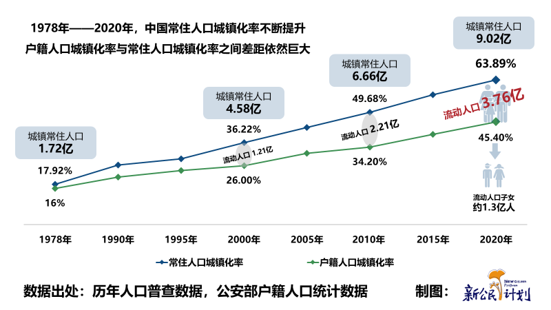 第七次全國人口普查數(shù)據(jù)顯示,2020年,中國城鎮(zhèn)常住人口9.02億,常住人口城鎮(zhèn)化率為63.89%,但是戶籍人口城鎮(zhèn)化率仍然只有45.4%,流動人口有3.76億人,比美國的總?cè)丝?3.31億人)還要多。其中流動人口子女約1.3億人,超過中國兒童總數(shù)的40%。