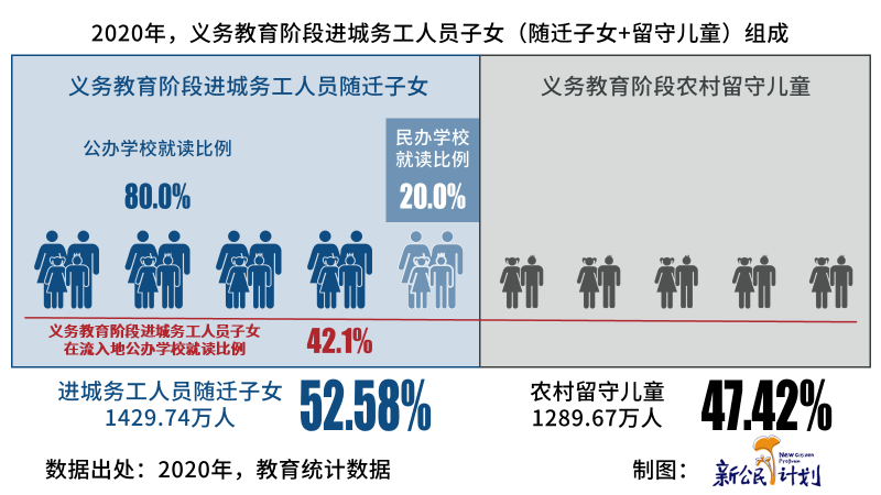 2020年,義務(wù)教育階段隨遷子女1999.88萬人,其中進城務(wù)工人員隨遷子女1429.74萬人,進城務(wù)工人員隨遷子女中,在公辦學(xué)校就讀的比例為80.0%。“城鎮(zhèn)”等隨遷子女(還包括少量遷入地是鄉(xiāng)村的隨遷子女)570.14萬人。