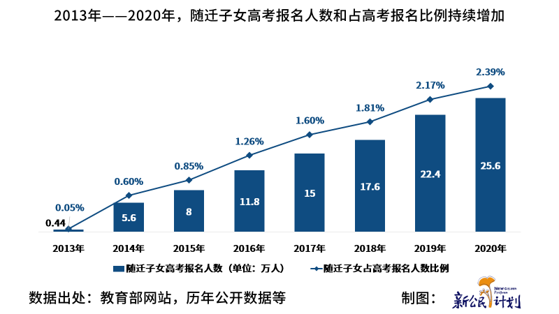 2013年,各省、自治區(qū)、直轄市“就地高考”政策陸續(xù)出臺,隨遷子女在居住地參加高考人數(shù)逐年增加,2013年只有0.44萬隨遷子女在居住地報名參加高考,2020年,已經(jīng)有25.6萬人隨遷子女在居住地報名參加高考,占當(dāng)年高考報名人數(shù)的2.39%。