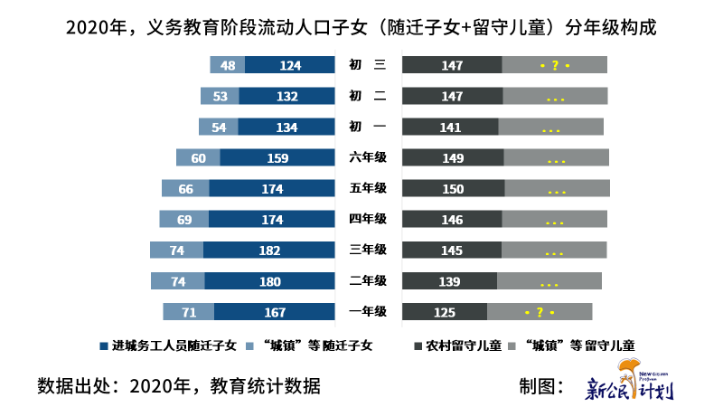 2012年,農(nóng)村留守兒童一年級在校生268萬人,此后隨著年級的升高,在校生人數(shù)逐年減少,至2020年,農(nóng)村留守兒童初三在校生人數(shù)147萬人,考慮到近年來流動人口規(guī)模仍然在逐年上升,隨遷子女規(guī)模又沒有同步增加,因此農(nóng)村留守兒童規(guī)模的減少,很大概率會轉(zhuǎn)化成“城鎮(zhèn)”等留守兒童,雖然離開了農(nóng)村,但是留守的狀況卻并未改變。