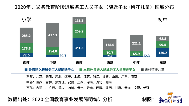 2020年,小學(xué)階段,進城務(wù)工人員隨遷子女在校生中,東部地區(qū)占比58.08%,規(guī)模為601.0萬人,外省遷入進城務(wù)工人員隨遷子女在校生中,東部地區(qū)占比76.78%,規(guī)模為341.3萬人。初中階段,進城務(wù)工人員隨遷子女在校生中,東部地區(qū)占比55.65%,規(guī)模為219.8萬人,外省遷入進城城務(wù)工人員隨遷子女在校生中,東部地區(qū)占比75.73%,規(guī)模為120.2萬人。