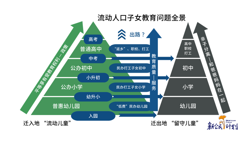 對于一個流動兒童來說,因為戶口跟居住地相分離,原本普通的升學(xué)路徑變得分外艱難 ,從入園開始,到后邊的幼升小、小升初、中考、高考,每一小步,都是一道難關(guān)。如果闖關(guān)不過,還不想讓孩子與父母分離、成為留守兒童的話,那么大概率只能選擇圖中的藍(lán)色路線,幼兒園入讀“低收費”民辦幼兒園,在小學(xué)、初中階段入讀民辦打工子女學(xué)校,到了高中階段,讀職?;蛘叽蚬?,如果想要參加高考的話,一般只能選擇“返鄉(xiāng)”去到戶籍地讀高中。在這條路上,一般要付出比綠色路線更多的金錢,接受的卻是一路“堪憂”的教育。