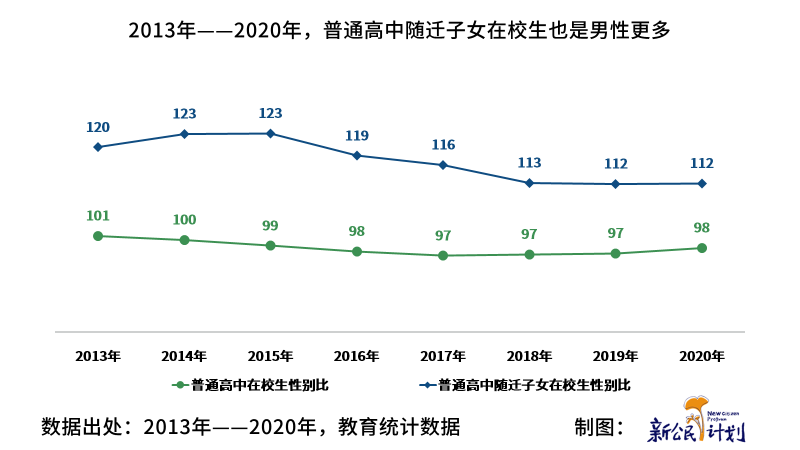 2013年——2020年,普通高中隨遷子女在校生的性別比,與義務(wù)教育階段情況類似,隨遷子女在校生的性別比一直比全國普通高中在校生的性別比高10-20個百分點。2016年以后,隨遷子女在校生性別比逐年下降,至2020年,普通高中隨遷子女在校生性別比仍然高于全國平均14個百分點,這一結(jié)果更像是早期隨遷子女性別比的情況,在升學(xué)過程中的自然延續(xù)?! ?/p>