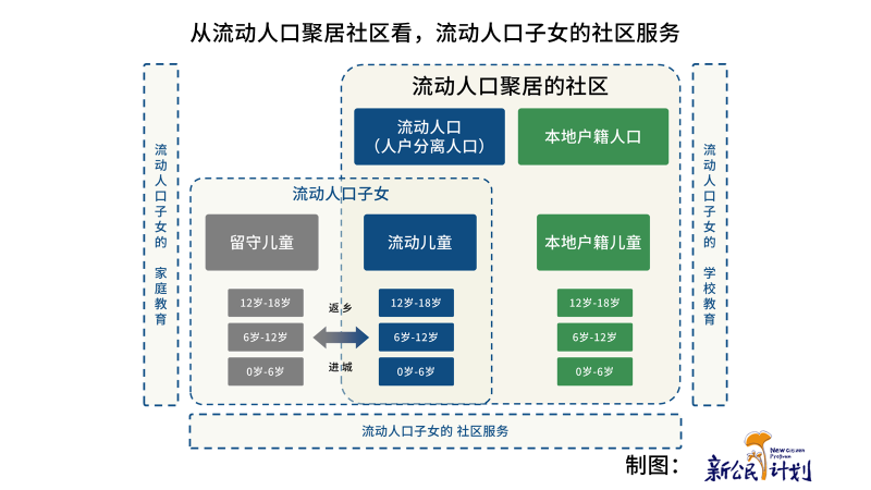 流動人口子女的課外服務(wù),按照人口遷入和遷出,分為人口流入地區(qū)(以流動兒童為主)和人口流出地區(qū)(以留守兒童為主);按照服務(wù)場景,分為在學(xué)校提供的服務(wù)和在社區(qū)提供的服務(wù)。“雙減”政策以來,教育部正在加大力度提升學(xué)校課后服務(wù)水平,因此本文將聚焦于討論社區(qū)場景,在人口流入地區(qū),流動人口子女主要居住在老城區(qū)、城中村或城鄉(xiāng)結(jié)合區(qū);在人口流出地區(qū),則廣泛分布在中西部城鎮(zhèn)和鄉(xiāng)村地區(qū)。