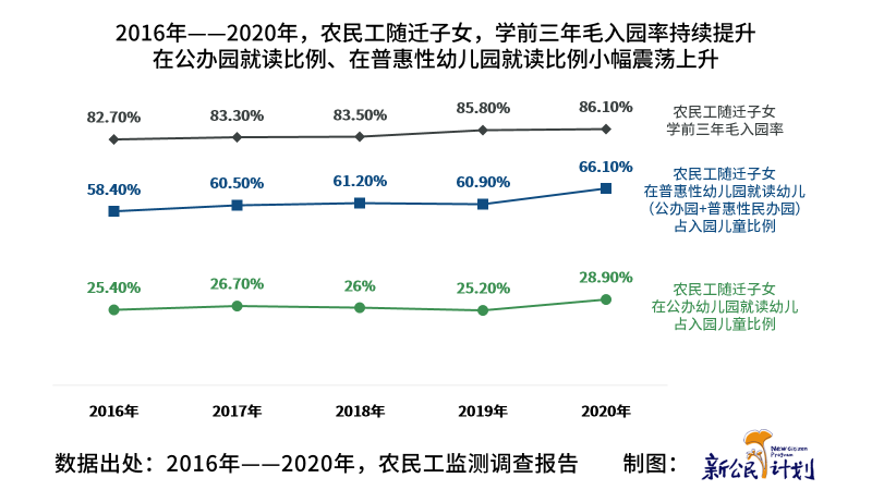 從2016年開始,國家統(tǒng)計局在每年發(fā)布的《農(nóng)民工監(jiān)測調(diào)查報告》中,都有披露農(nóng)民工隨遷子女接受學(xué)前教育的情況。2016年——2020年,農(nóng)民工隨遷子女進入公辦園就讀的比例略高于25%,近3/4的農(nóng)民工隨遷子女在民辦幼兒園就讀,在普惠性幼兒園(公辦園+普惠性民辦園)就讀的比例在60%左右。