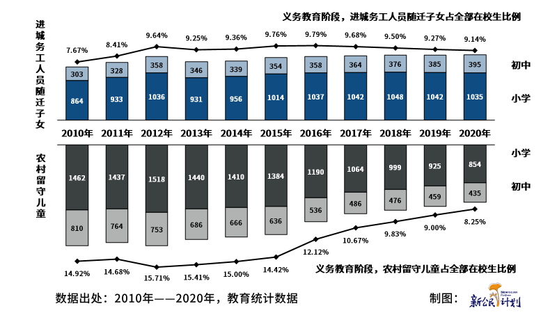 隨著流動人口規(guī)模的增長,中國流動人口子女規(guī)模同步增長,2020年,中國流動人口子女規(guī)模約1.3億人(參考《2015年中國兒童人口狀況,事實與數(shù)據(jù)》,《第七次人口普查數(shù)據(jù)公報》,《2015年-2020年,教育統(tǒng)計資料》估算),超過中國兒童總數(shù)的40%。對于許多流動人口家庭來說,把孩子帶在身邊成為流動兒童,在居住地城市會面臨各種入學(xué)、升學(xué)方面的困難;送回“老家”成為留守兒童,就不能親自養(yǎng)育和陪伴孩子的成長,對于每個流動中的家庭來說,“流動”還是“留守”是一個兩難的選擇。