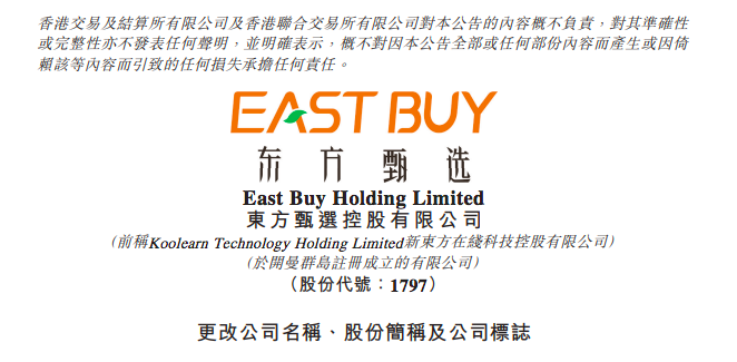 多知網(wǎng)3月9日消息,東方甄選(01797.HK,前稱新東方在線)今日發(fā)布公告稱,公司的英文名稱已由“KoolearnTechnologyHoldingLimited”更改為“EastBuyHoldingLimited”,雙重外文名稱已由“新東方在線科技控股有限公司”更改為“東方甄選控股有限公司”。中英文股份簡稱將由“KOOLEARN”及“新東方在線”分別變更為“EASTBUY”及“東方甄選”,自2023年3月14日上午九時正起生效。公司股份代號仍維持“1797”不變。此外,公司的標(biāo)志也作相應(yīng)更改,自公告日期起生效。