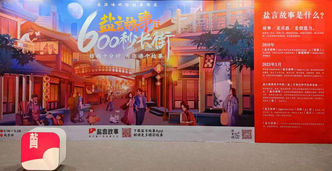 在App上線的同時,自5月18日起至5月31日,知乎“鹽言故事”還于北京坊策劃了一場“600秒長街”線下活動?;顒油ㄟ^創(chuàng)意互動裝置帶訪客沉浸式走進(jìn)鹽言特色故事。走過長街,訪客可以在“戲臺”裝置前了解“知乎三絕”,也可以通過“畫卷”裝置領(lǐng)略古代言情故事的魅力,還可以觀看“月亮”裝置體會腦洞故事的精彩,吸引了眾多年輕人前來打卡體驗(yàn)。
