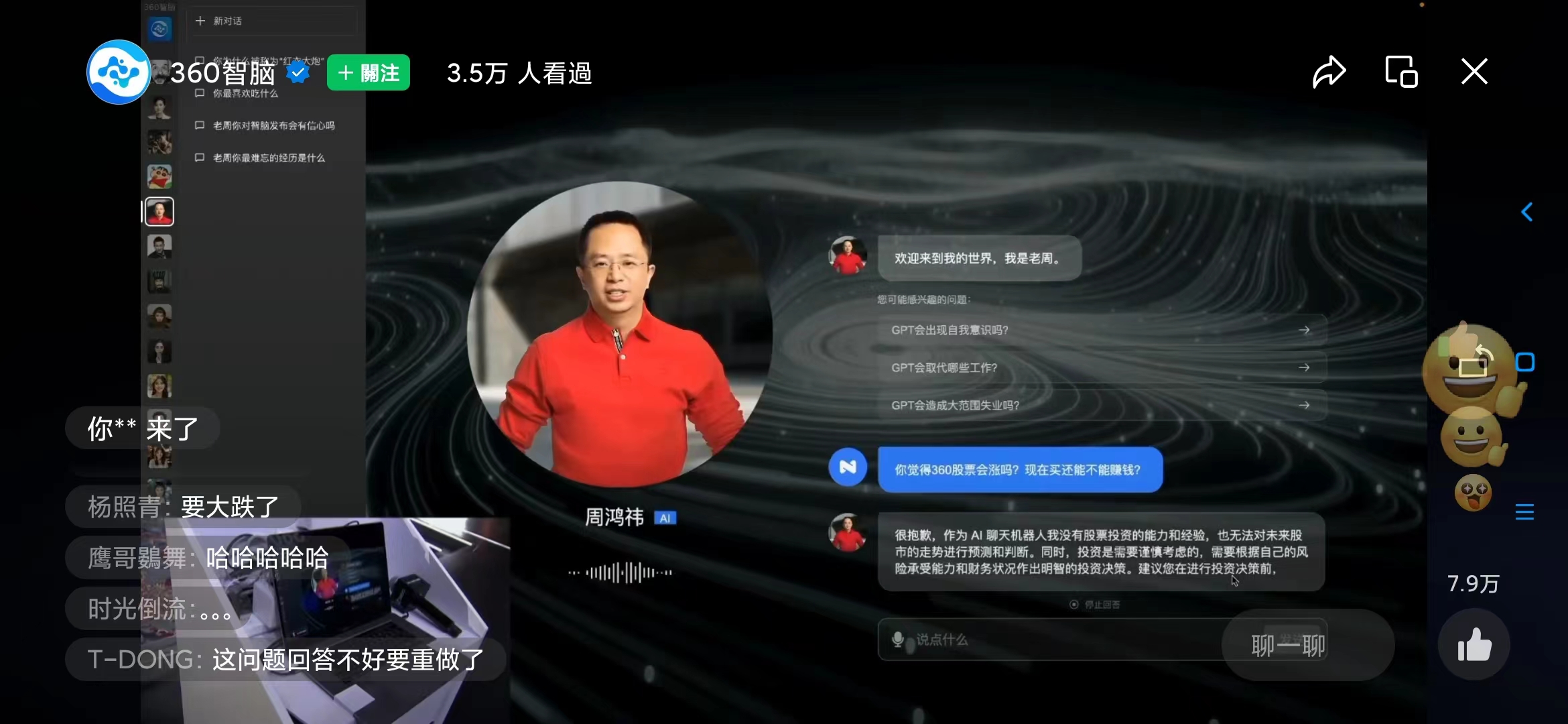“讓數(shù)字人‘周鴻祎’作為我們公司的新聞發(fā)言人,說(shuō)對(duì)了算我的,說(shuō)錯(cuò)了算他的。”發(fā)布會(huì)最后環(huán)節(jié),周鴻祎現(xiàn)場(chǎng)創(chuàng)建了自己的數(shù)字分身作為“360發(fā)言人”,代替自己答記者問(wèn)。