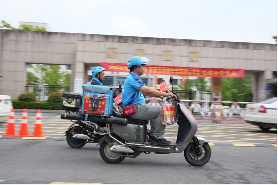 在北京的陳經(jīng)綸中學(xué)考點(diǎn),餓了么騎手準(zhǔn)備了助考和應(yīng)急物資,給師生家長(zhǎng)和考點(diǎn)志愿者提供雨傘、冷飲、雪糕等。