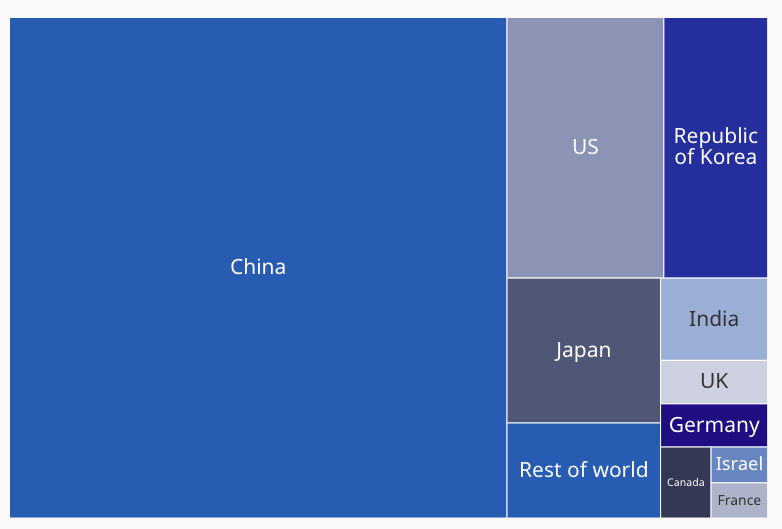 據(jù)這份《世界知識(shí)產(chǎn)權(quán)組織生成式人工智能專利態(tài)勢(shì)報(bào)告》顯示,2014年到2023年,有關(guān)生成式人工智能的技術(shù)專利申請(qǐng)數(shù)量激增,全球生成式人工智能相關(guān)專利申請(qǐng)量達(dá)5.4萬(wàn)件,其中逾25%的專利于去年公布。過(guò)去十年里,中國(guó)提交了超過(guò)3.8萬(wàn)項(xiàng)關(guān)于生成式AI的專利申請(qǐng),同期美國(guó)僅提交6276項(xiàng),位居第二。韓國(guó)、日本、印度分列第三、第四、第五位。