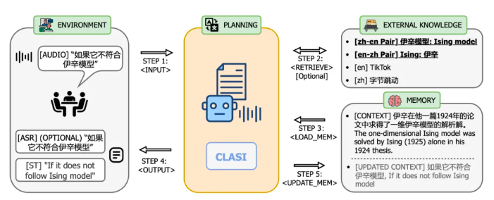 系統(tǒng)架構(gòu)上,CLASI 采用了基于 LLM 智能體的架構(gòu),將同聲傳譯定義為一系列簡(jiǎn)單且協(xié)調(diào)的操作,包括讀入音頻流,檢索(可選),讀取記憶體,更新記憶體,輸出等。整個(gè)流程由大語(yǔ)言模型自主控制,從而在實(shí)時(shí)性和翻譯質(zhì)量之間達(dá)到了高效的平衡。該系統(tǒng)能夠根據(jù)實(shí)際需求靈活調(diào)整各個(gè)環(huán)節(jié)的處理策略,確保在高效傳遞信息的同時(shí),保持翻譯內(nèi)容的準(zhǔn)確性和連貫性。CLASI 底層模型是一個(gè) Encoder-conditioned LLM,在海量的無(wú)監(jiān)督和有監(jiān)督數(shù)據(jù)上進(jìn)行了預(yù)訓(xùn)練。