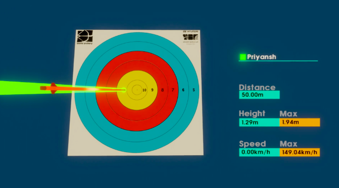 但實際上,箭矢運動中的過程也很重要,卻往往缺乏相應(yīng)的轉(zhuǎn)播語言。在射箭運動中,箭矢在離弦一剎那,會受到弓弦彈力影響而發(fā)生動態(tài)彎曲,并導(dǎo)致在飛行過程中像魚一般左右擺動。刮風(fēng)、下雨等天氣變化,也會影響箭矢的運動姿態(tài)。箭矢的最終飛行軌跡,決定了能否命中靶心。準確感知風(fēng)速、精準掌握力道,才能以最佳的最高點離地距離、速度和飛行距離這些關(guān)鍵技戰(zhàn)指標,制勝賽場。這些指標也能很好地反映一名運動員的水平、技術(shù)特色、發(fā)揮穩(wěn)定性,以及面對不同環(huán)境的技戰(zhàn)術(shù)靈活性。